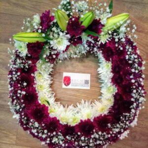 ALWAYS IN OUR HEART (Funeral Wreath) – 2 or more colour mix of White, Yellow, Pink, Red, or Purple chrysanthemums with Gypso