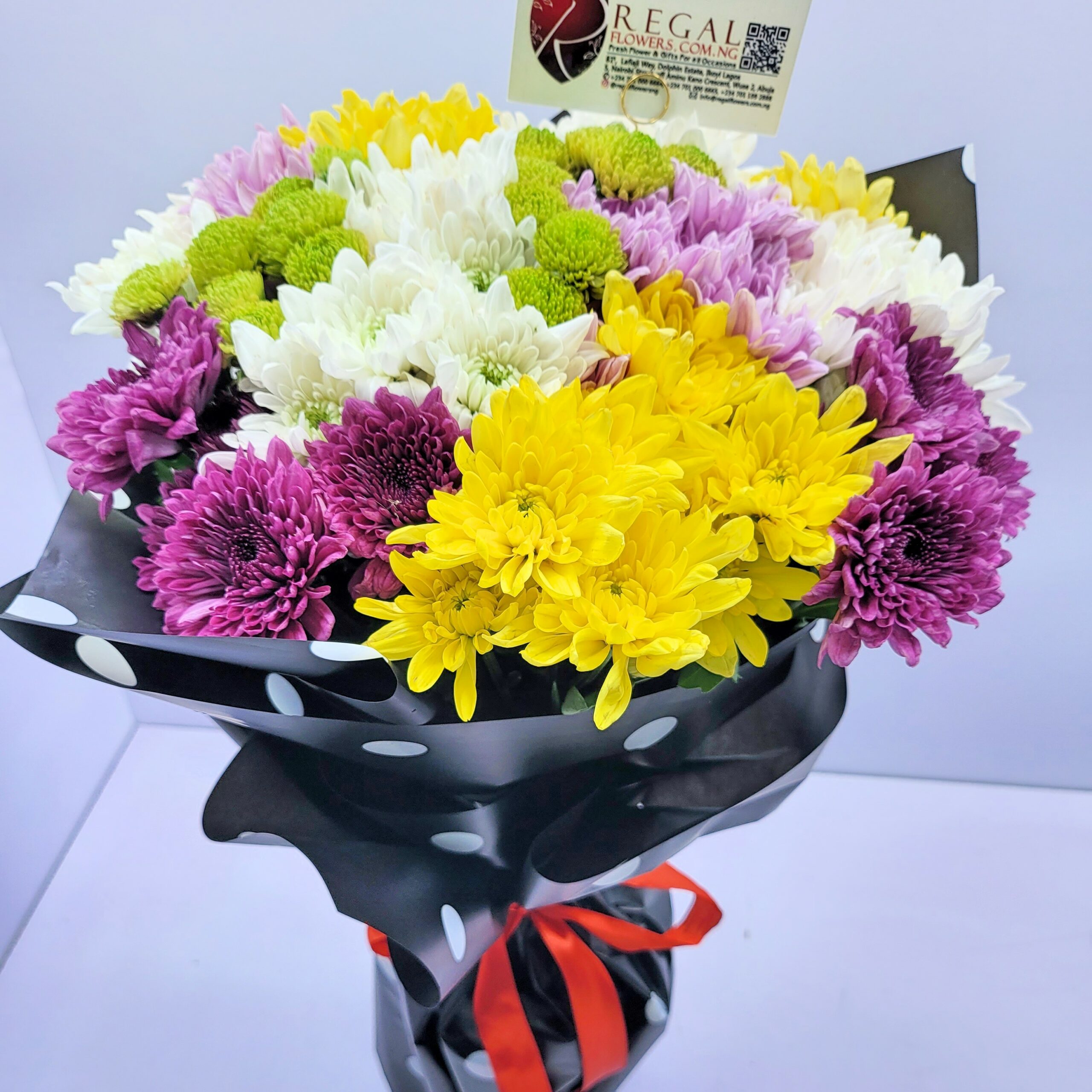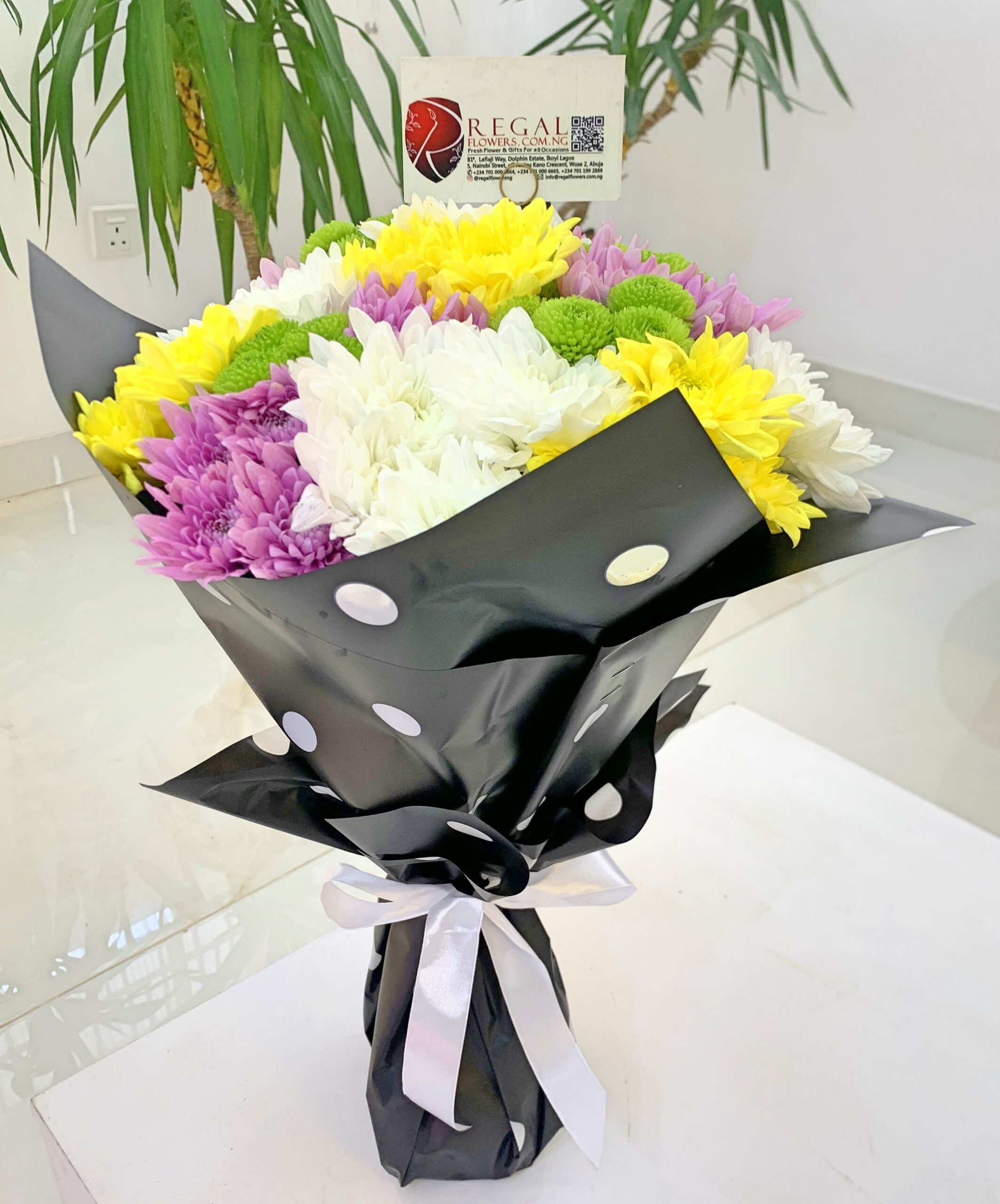 Cool and Classic is a mixture of bright and vibrant chrysanthemums. Chrysanthemums are always a great and versatile choice for gifting a lover, colleagues, friends, family members, and others close to you. They usually come in various bright colours such as white, yellow, lilac, green, purple, etc.