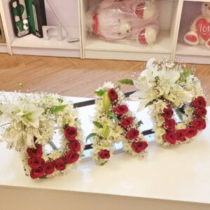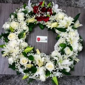 A dazzling arrangement of red, white, yellow, pink or orange chrysanthemum and red roses with gypso in a cross wreath base.