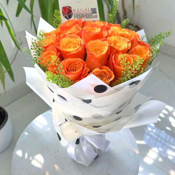 Rich arrangement of orange roses, million star (gypsophila) flowers. Available in various sizes