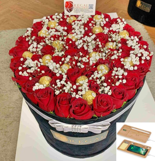 Elegant mix of Fresh cut Roses, gypso interlaced with luxurious Ferrero Rocher chocolates.